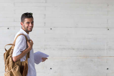 Young man smiling while posing with backpack and exercise books isolated over white background