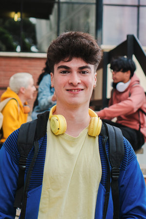 Vertical portrait of a college teenage student carrying a backpack, and headphones smiling and looking at camera standing at high school. On foreground a young male at university