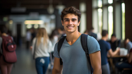 Smiling student in school hallway with backpack and casual shirt.