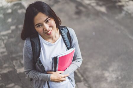 Happy student young girl with backpack at school.