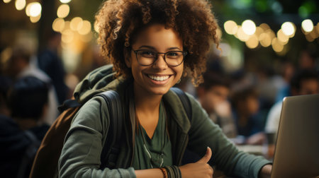 Black female student refugee with a backpack at a university campus. Young woman. Concept of academic aspirations, new beginnings, immigrant education, refugee integration, diversity