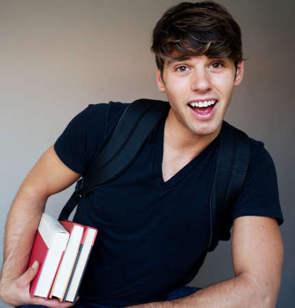 portrait of a young male student with books in a studio