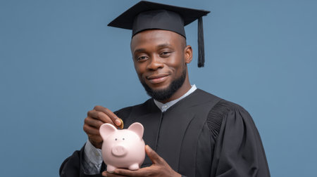 A young male graduate in a black cap and gown is smiling while placing a coin into a pink piggy bank, symbolizing hope for financial success and future goals.