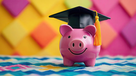 This charming piggy bank wearing a graduation cap represents the importance of saving for education. Bright colors enhance the theme of financial planning for students.