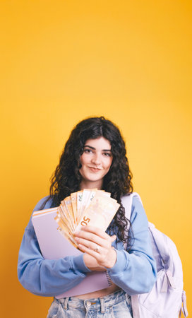A teenage girl shows a lot of dollar bills and smiles with a place for text.