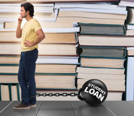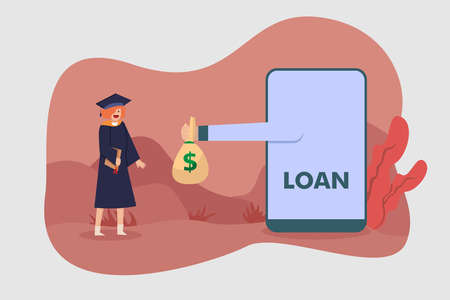 Student Loan bubble vector concept. Male student in graduation hat holding a balloon with student loan text