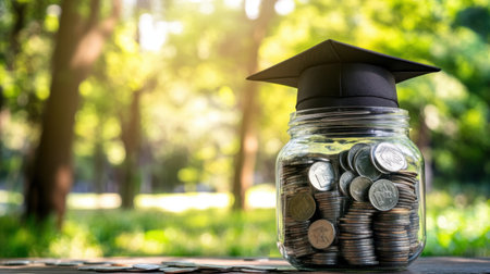 A glass jar filled with coins topped with a graduation cap sits in a vibrant outdoor setting. This image symbolizes savings for education and financial growth.