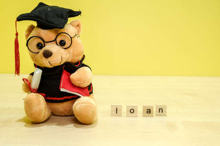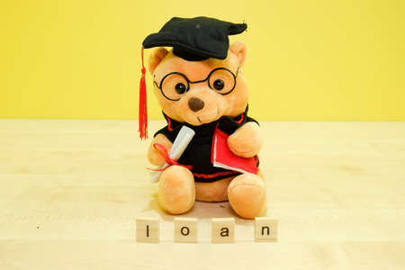 Teddy bear with graduation cap and diploma on yellow background. Education concept.