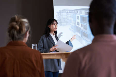 Portrait of female marketing expert giving presentation by projector screen and talking to audience in business training, copy space