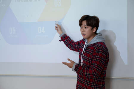 College student explaining some ideas on a touch TV in classroom.