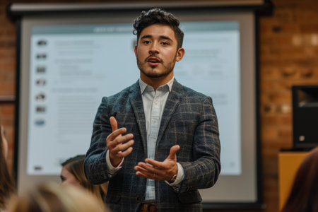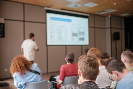 Presenter speaks into microphone while projected slides fill screen. audience sits facing forward, notes ready, focused on lecture. modern classroom event encourages learning, professional growth