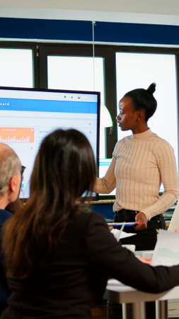 African project manager holding financial meeting showing statistical graphs and charts on interactive whiteboard touchscreen device. Executive director working in broadroom of creative agency.