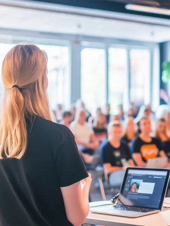 A speaker engages an attentive audience in a modern setting, promoting interactive dialogue and idea exchange.