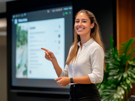 A businesswoman giving a presentation in front of a screen. AI generated