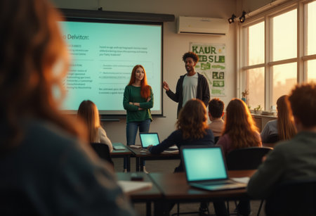 Two presenters stand at the front of a classroom, leading a business workshop with participants taking notes and using laptops. The image highlights education, collaboration, and professional development.