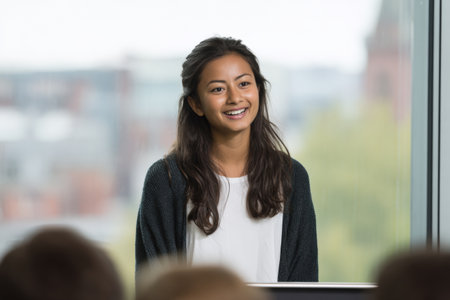 A young woman with long, dark hair is smiling and looking towards the right while speaking at a podium. She is wearing a white shirt and a dark, textured cardigan. The background is blurred, showing hints of a building and greenery, suggesting an indoor setting with a view. The focus is on the woman's engaging expression and her presence at the podium.