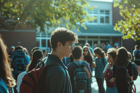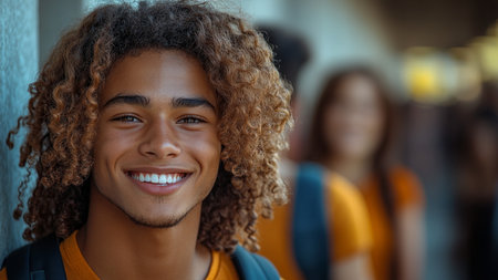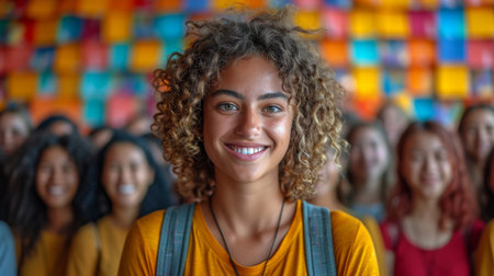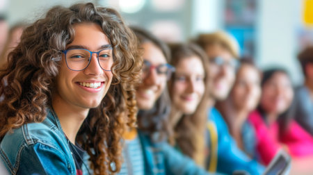 A group of happy students stands closely together their smiling faces brightening the school corridor during a busy day.