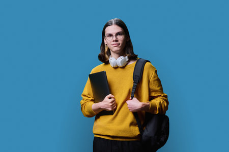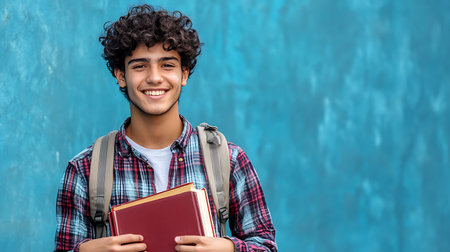 Smiling boy with curly hair holding notebooks against bright blue background, embodying trendy and cheerful school lifestyle