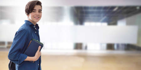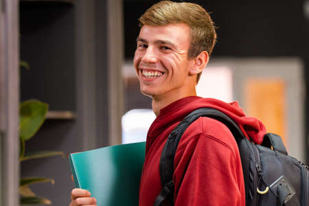 Rear view of beautiful boy walking down a university hallway, looking back and smiling. The student is going to a lecture.