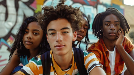 A vibrant portrait capturing youthful energy and diversity, featuring four friends with unique styles against a colorful urban backdrop. Generated AI brings this scene to life with a modern touch