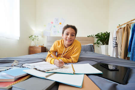 Portrait of smiling mixed race high school girl lying on bed among workbooks in own room and taking notes while doing homework