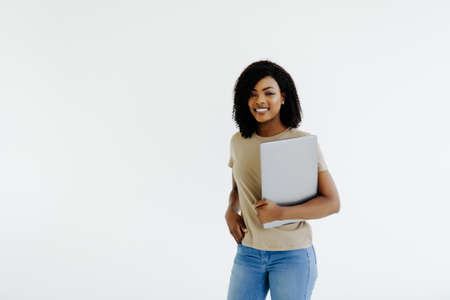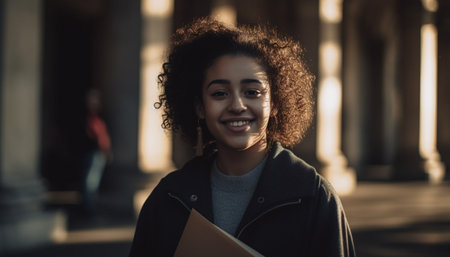 Student in library Smiling African teenager holding a book and smiling at camera while standing at the library : Generative AI