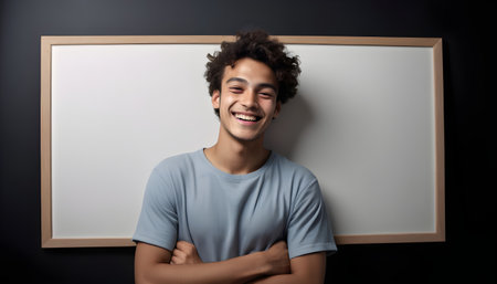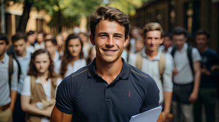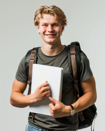 A young caucasiand blond guy student smiles while standing with a book with a blank cover in his hands. AI generative