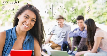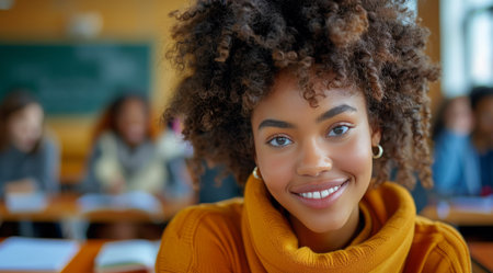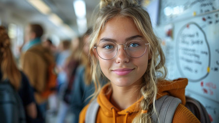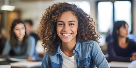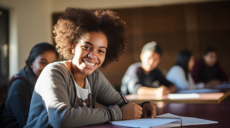 Working hard for good grades Beautiful young woman writing and looking at camera while her classmates studying in the background : Generative AI