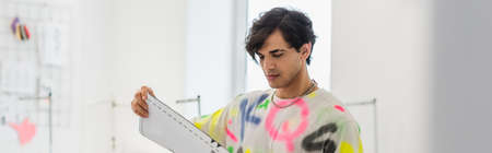 trendy fashion designer looking at sewing pattern in tailor shop, banner