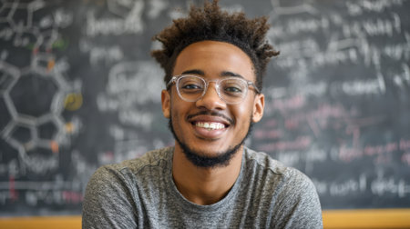A young man with glasses and a beard is smiling at the camera. He is wearing a gray shirt and sitting in front of a chalkboard. The chalkboard has various equations and diagrams on it
