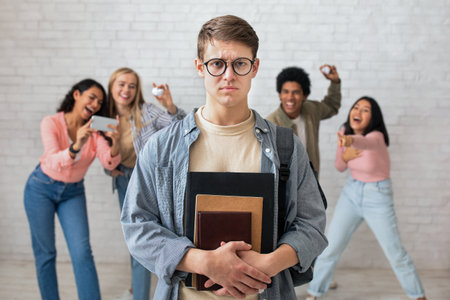 Humiliation and bullying at school. Focus on sad young guy in glasses and notebooks