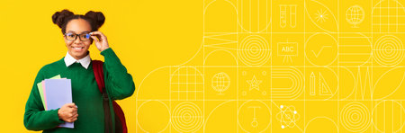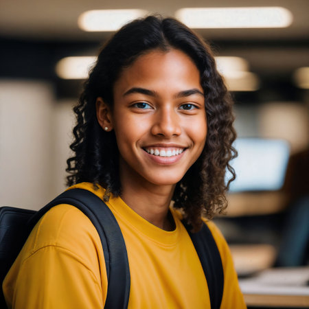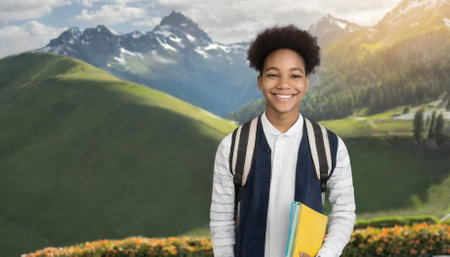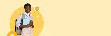 This vibrant image features a cute young Black student with a confident, successful smile on a transparent background, embodying achievement, diversity, and positivity for educational and