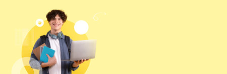 Composition of smiling schoolboy in class, with yellow block copy space on right. school, education and study concept digitally generated image.