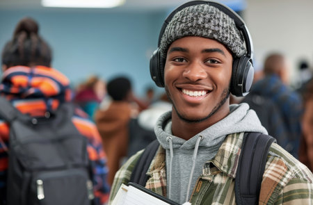 Student, headphones and portrait of black man, campus or university with smile. Face, class or