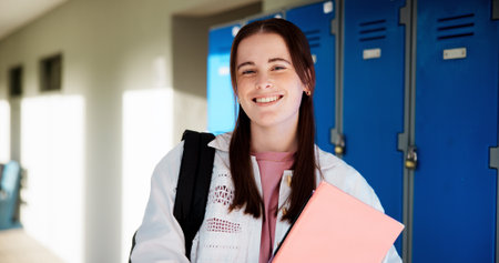 Education, portrait and girl smile with book in hallway for academic learning, study or ready for class. Student, teenager and happy at high school for knowledge, scholarship or development on campus