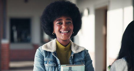 Woman, college student and tablet in portrait with smile, confident and pride for scholarship at campus. Girl, happy and tech with bag, application or education for learning development at university