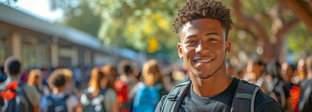 Happy, man or student portrait smiling wearing a backpack, at university, college or school