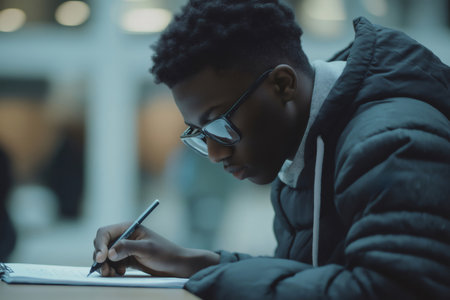 Young black man wearing glasses, deeply concentrating while jotting down notes at a university library, immersed in his studies