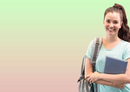 Portrait of caucasian female college student smiling with copy space on gradient background. college and education concept