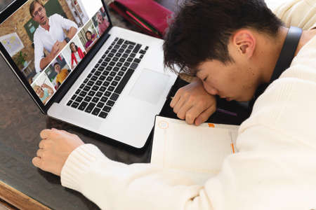 High angle view of asian teenage boy sleeping in front of laptop during online lecture at home. Tired, boredom, unaltered, childhood, wireless technology, education, student and e-learning concept.