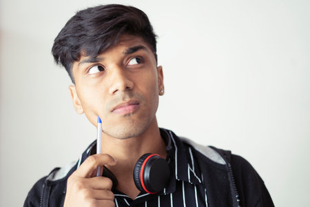 portrait of asian young man good grooming holding pen looking sideways with doubtful expression.