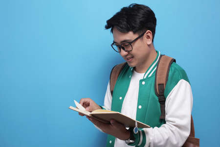 Happy young confident success Asian male student wearing glasses and green baseball jacket reading and smiling at camera, visionary education concept, standing against blue background