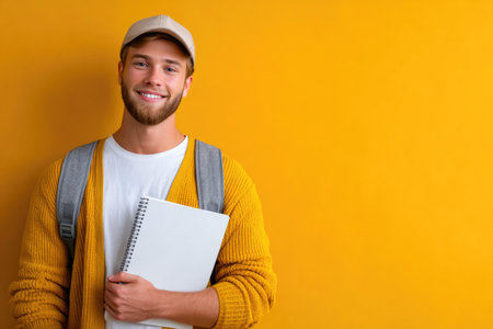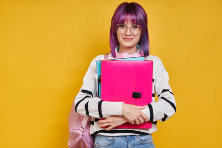 Confident teenage girl with backpack carrying folders while standing against yellow background