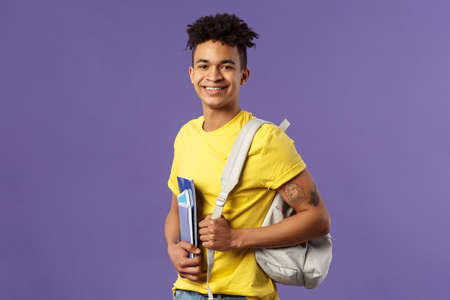 Back to school, university concept. Portrait of handsome charismatic hispanic guy, student walking to campus, going for lecture, studying hold backpack and notebooks, stand purple background