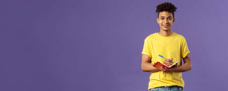 Portrait of young hispanic male student studying online courses, writing down lecture, making personal schedule or taking notes in planner, look camera enthusiastic and interested, purple background.