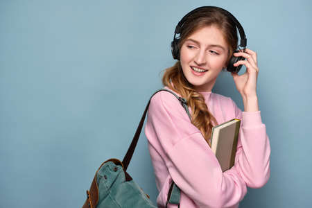 Young female student pointing up at copy space isolated on blue background. Teenager with long hair wearing headphones and backpack