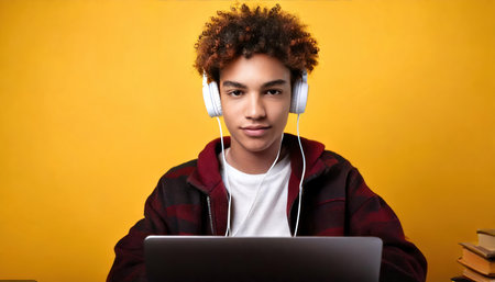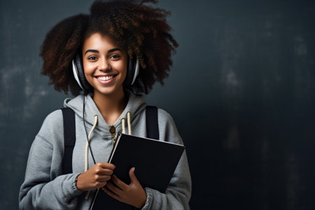 Sideways portrait of happy African American female student with dark skin learns foreign language on audiobook downloaded on smart phone listens audio in modern white hea : Generative AI