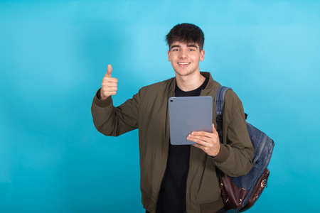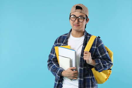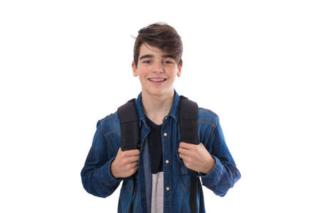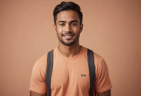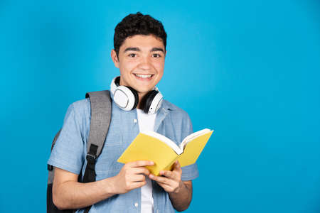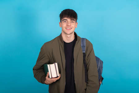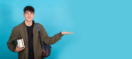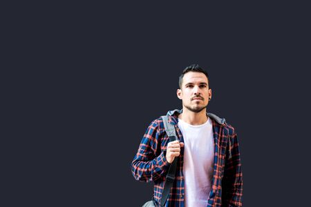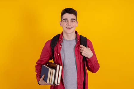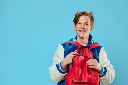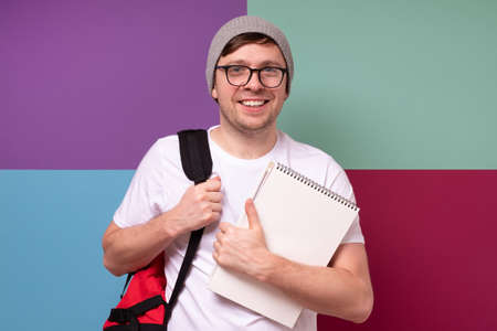 Portrait of positive student guy with backpack looking at camera, studio light background