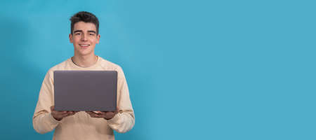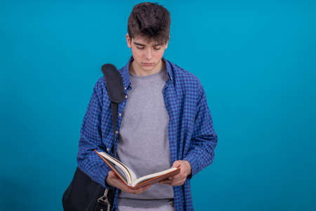 Study process. Male student. Educational period. Happy stylish hipster man writing in copy book on hands isolated blue copy space.