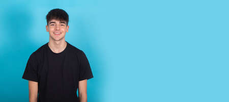 Portrait of cheerful young blond man smiling looking at camera. Happy teen at studio